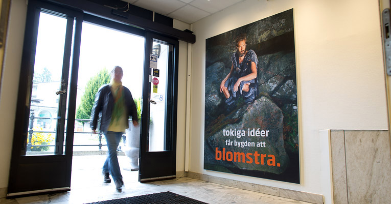Entrévepa i Valdemarsviks Sparbank. Här har banken låtit besökarna mötas av det centrala budskapet: Välkommen med dina tokiga, innovativa och oprövade idéer - vi hjälper dig.